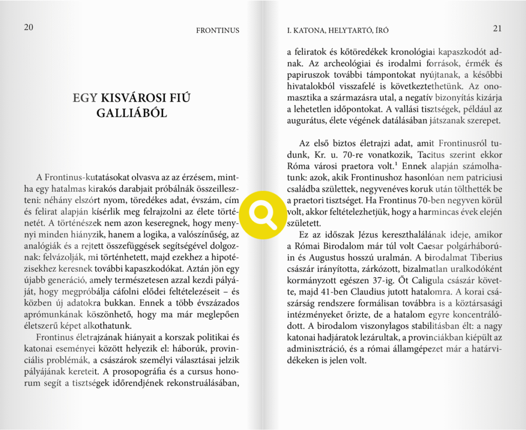 Frontinus nemcsak hadvezér és hivatalnok volt, hanem férj, apa, gondolkodó ember is, akinek dilemmái és érzelmei alakították a döntéseit. A könyv újszerű portrét rajzol róla: új források és értelmezések alapján mutatja be életét, többek között a Rómában végzett kutatások és a Monte Cassinóban őrzött legrégebbi Frontinus-kódex tanulmányozása nyomán. A személyes oldal mellett helyet kapnak a hihetetlen történetek is: levágott fejek ballisztával, váratlan római hétköznapi helyzetek és katonai fortélyok. Közérthető módon tárul fel az ókori Róma vízhálózata és a víztolvajlás elleni küzdelem, miközben megtudhatjuk, hogyan szervezett új rendszert a császárok megbízottjaként. A magyar vonatkozások is fontosak: Frontinus művei Mátyás király corvinái között is szerepeltek. A szakmai hitelességet Grüll Tibor ókortörténész ajánlása erősíti, a történetmesélést pedig kiegészítik fikciós szövegek is, amelyek még közelebb hozzák Frontinust a mai olvasóhoz.